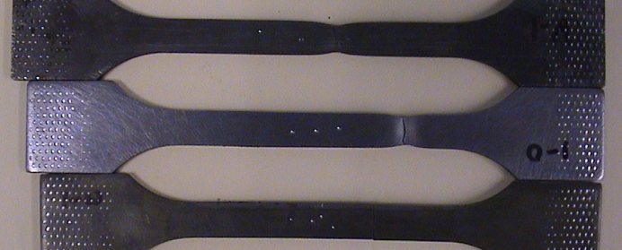 In this lab we work with one type of steel (usually 1050, which contains 0.5% carbon; sometimes 1010, which contains 0.1%). It is annealed at 850-900˚C to convert it to austenite (face-centered cubic crystal structure), then quenched into a bath of water or oil, or cooled in air. These treatments cause drastic differences in mechanical properties, as revealed in the video. The water-quenched sample contains a large amount of strong, brittle martensite, so it breaks after a small amount of stretching. Oil- and air-quenched samples are much more ductile. The difference in the final length of the samples is shown in the photo above.